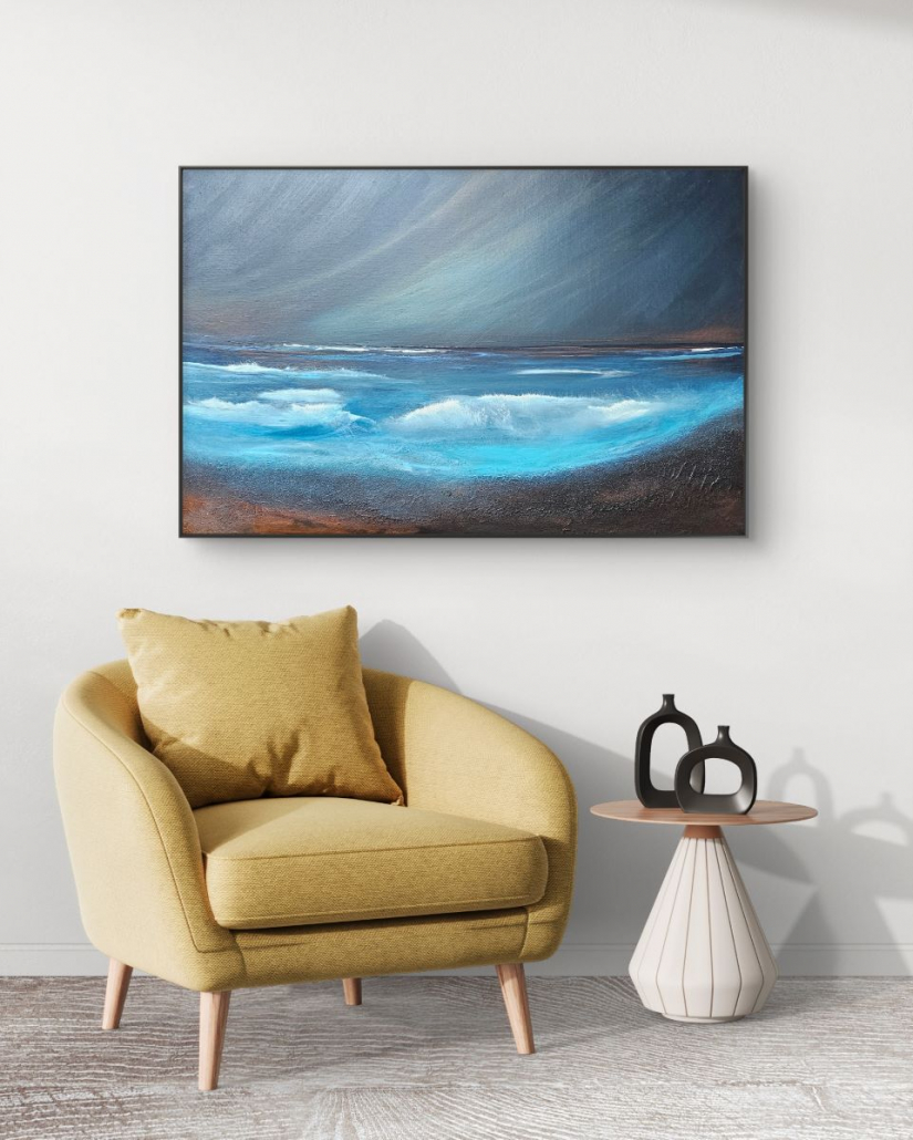 Trish creates original statement art, inspired by Cornish seas and skies and Scottish landscapes. Her individual and distinctive style captures movement, light and colour. Her work is atmospheric, ethereal and dramatic. Every piece stirs the soul, bringing meaningful beauty into your space, inviting you to reconnect with the places and moments you love..