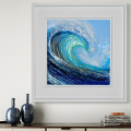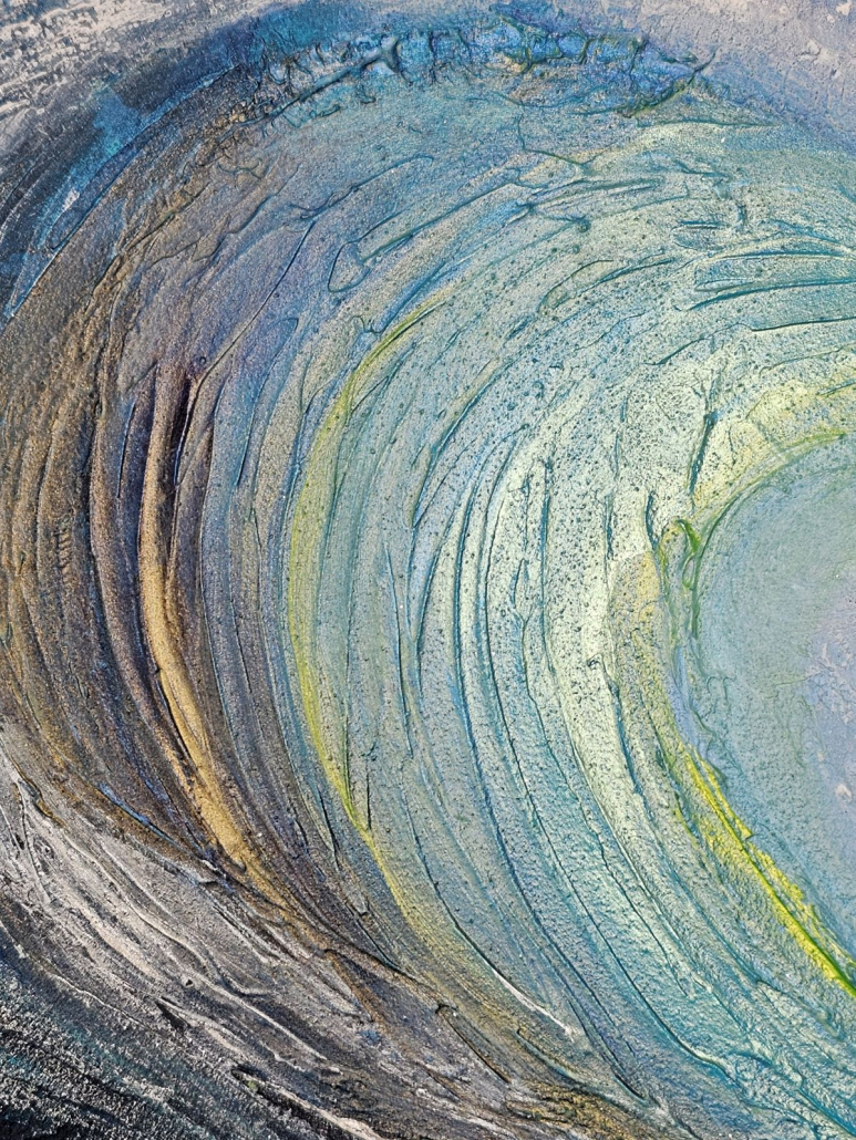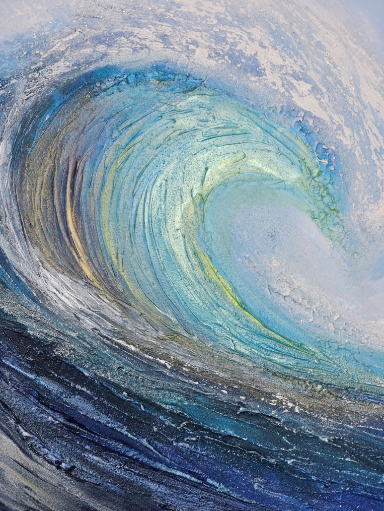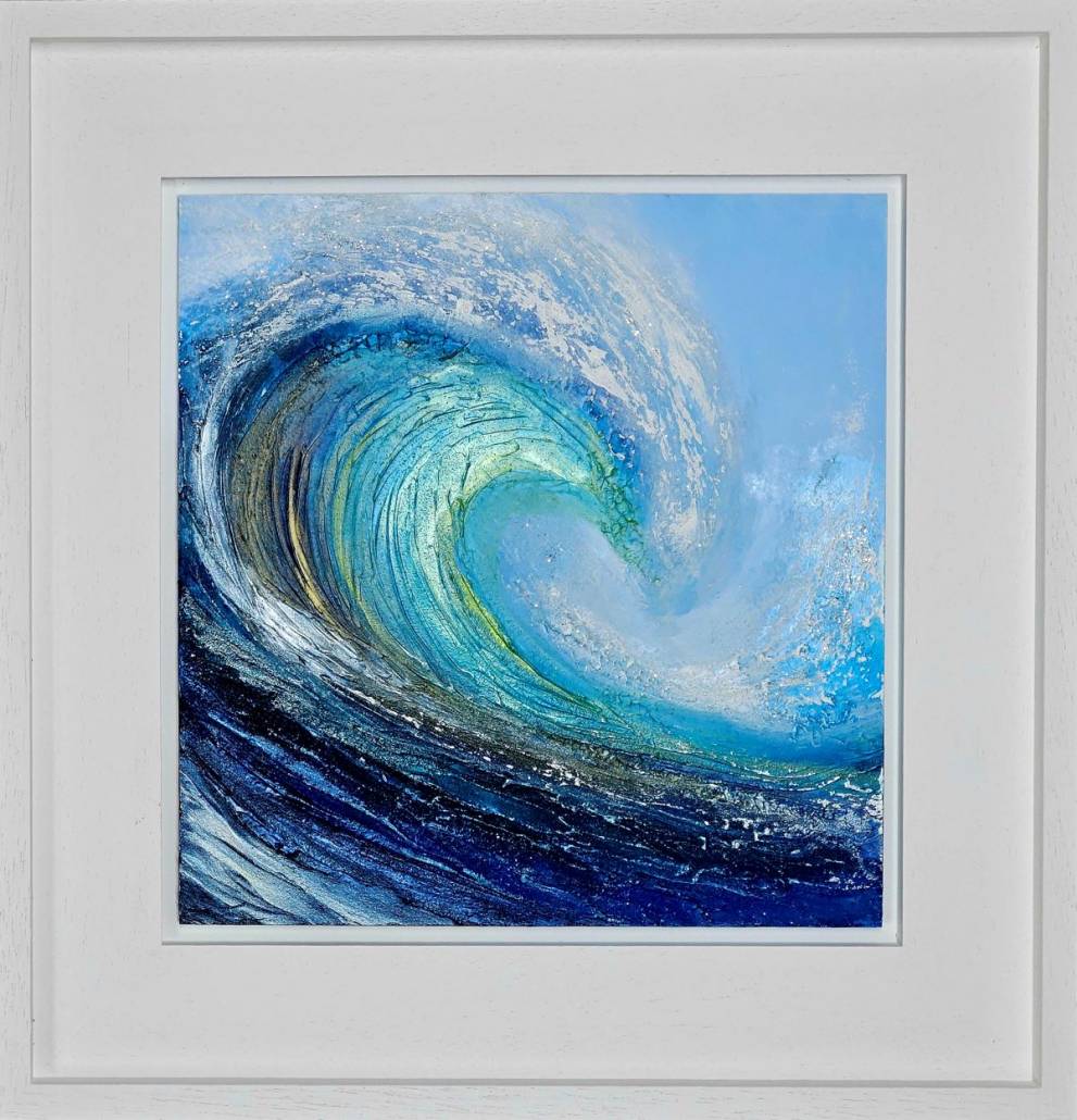 Becoming is a mixed-media exploration of movement, change, and emergence. Inspired by the fresh, ever-shifting seas of Cornwall, the piece captures a single wave in a moment of transformation. Powerful, luminous, and alive.