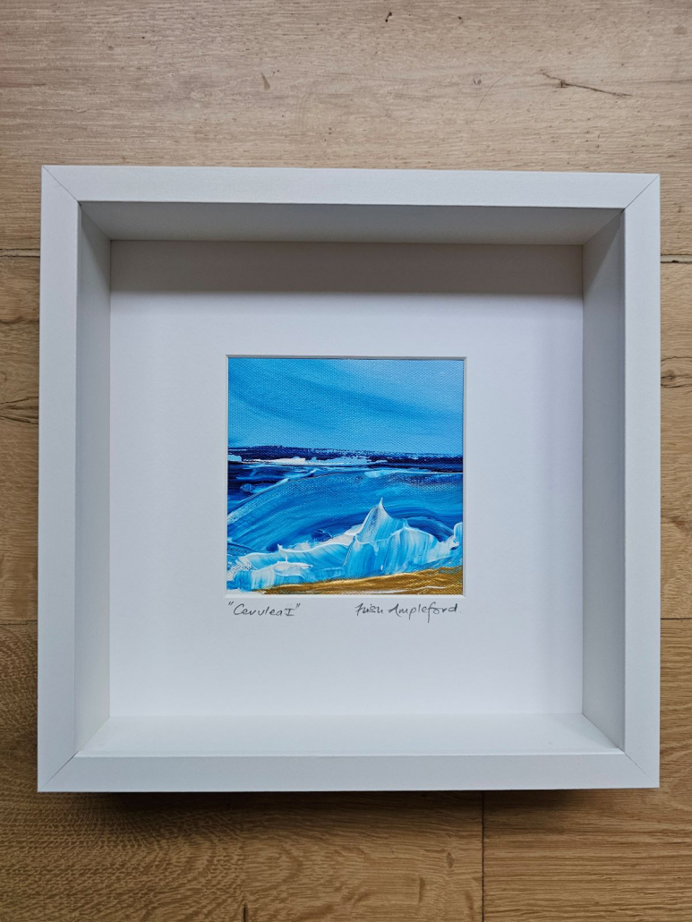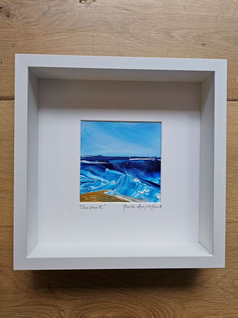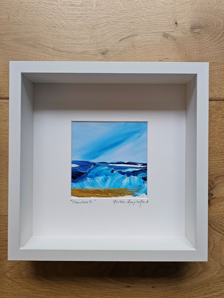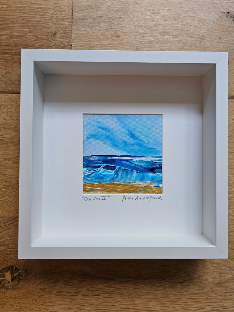 If you’re looking to bring the sea into your space these mini acrylic impasto pieces may be just the thing. Each one is different and captures the vibrant cerulean blue of the sea. All are signed and framed in crisp white deep wooden modern frames and ready to hang. These can be purchased individually for £95 each or £350 for the set of 4, plus P&P. If you would like to purchase one or all of these stunning pieces, please email me at trish@trishamplefordart.co.uk