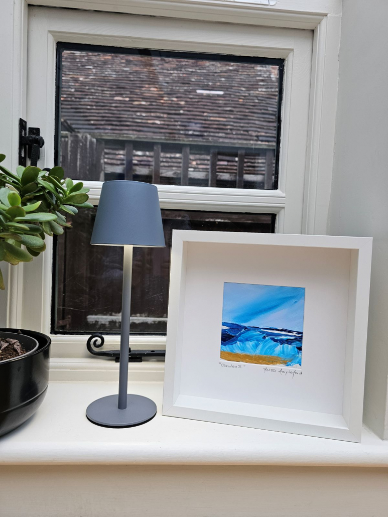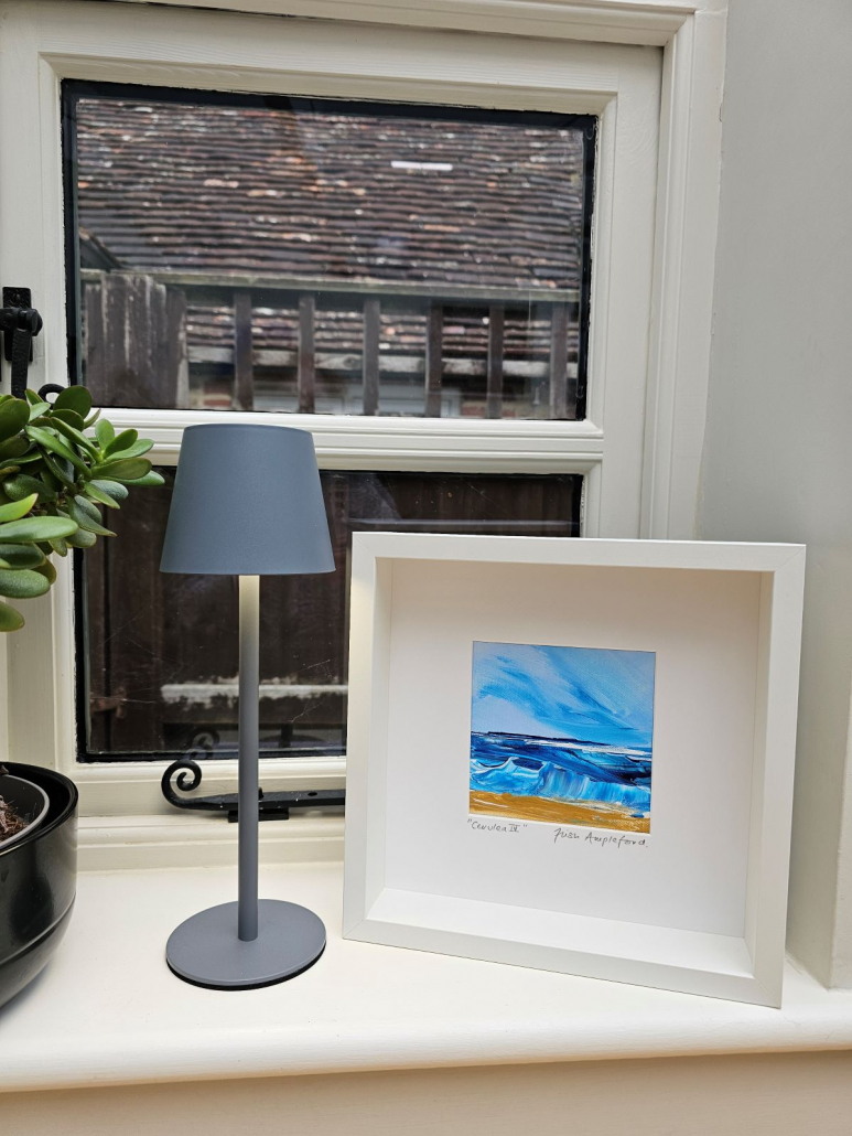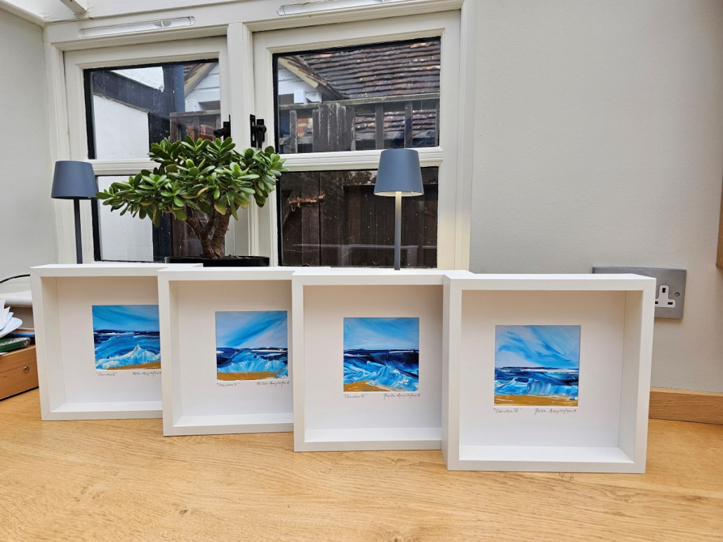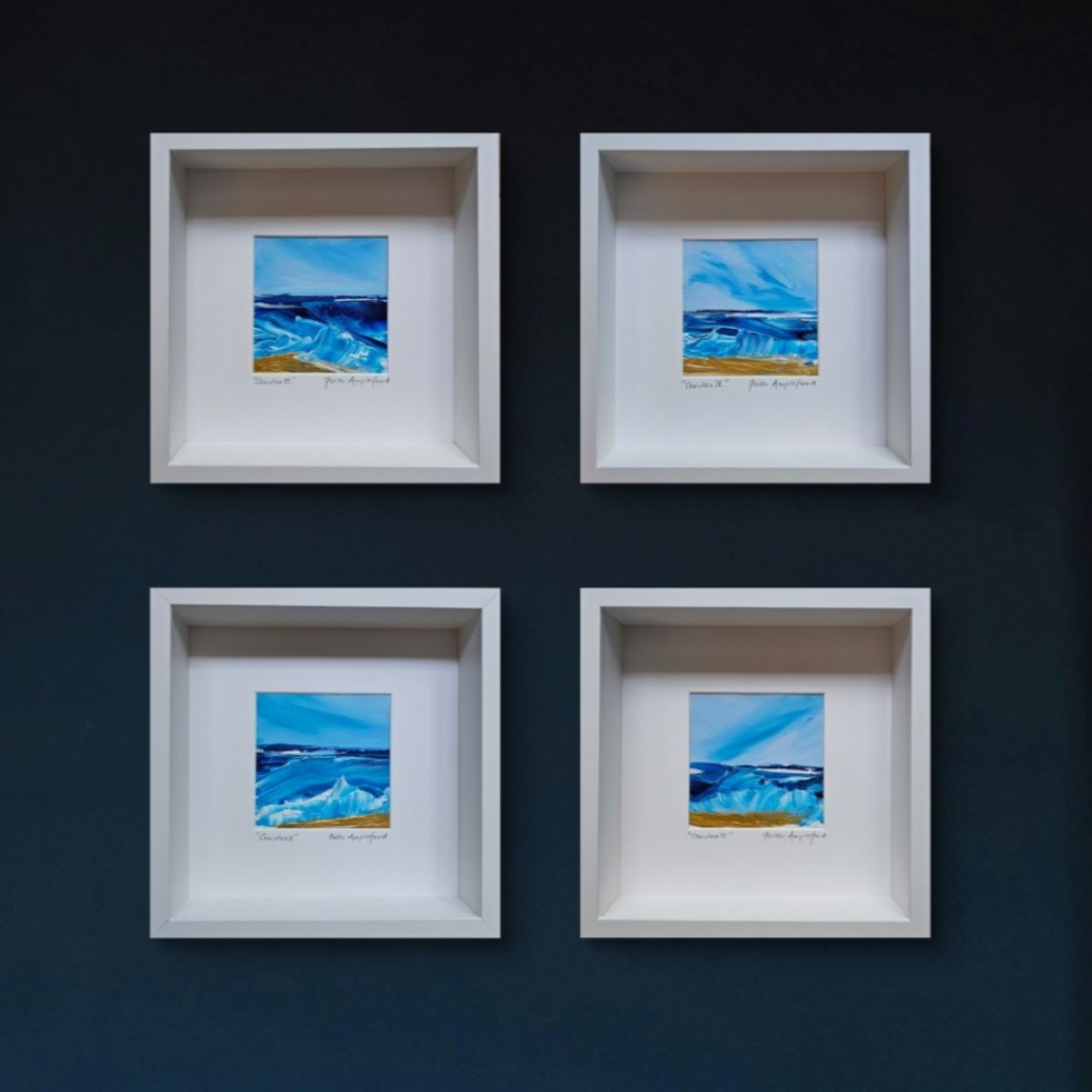 If you’re looking to bring the sea into your space these mini acrylic impasto pieces may be just the thing. Each one is different and captures the vibrant cerulean blue of the sea. All are signed and framed in crisp white deep wooden modern frames and ready to hang. These can be purchased individually for £95 each or £350 for the set of 4, plus P&P. If you would like to purchase one or all of these stunning pieces, please email me at trish@trishamplefordart.co.uk